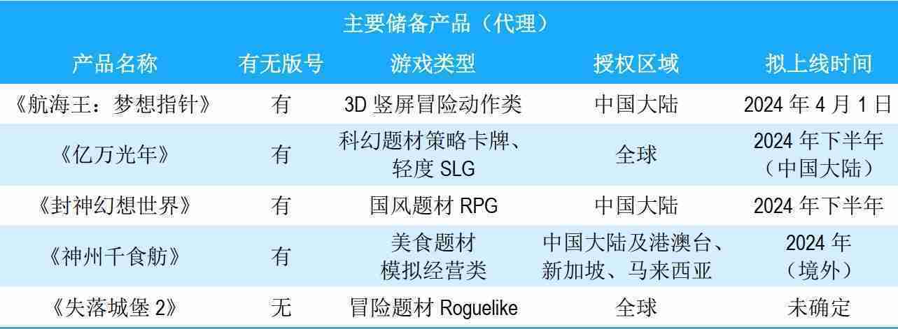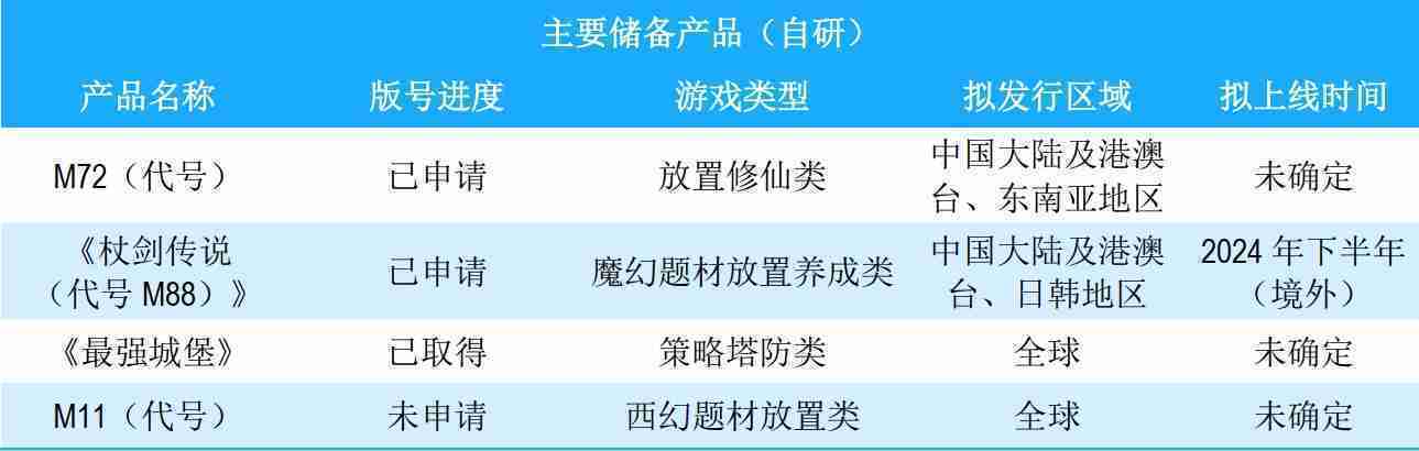 公司储备的多个自研、、代理产品都在有序推进当中,,,,涵盖放置类、、、策略类、、、模拟经营类、、、RPG、、Roguelike等多元化游戏品类,,,储备的主要自研和代理产品如下:::